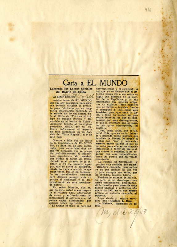 Carta a El Mundo: lamenta las lacras sociales del Barrio de Colón.