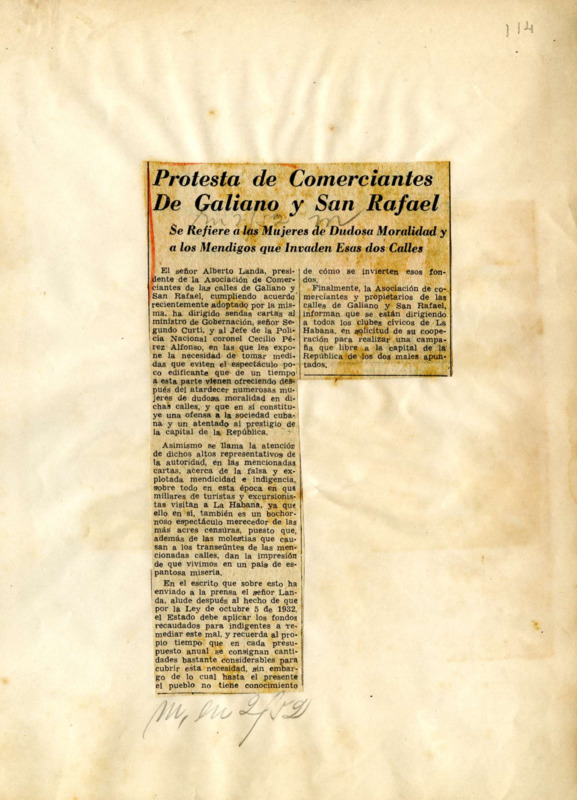 Protesta de comerciantes de Galiano y San Rafael: se refiere a las mujeres de dudosa moralidad y a los mendigos que invaden esas dos calles.