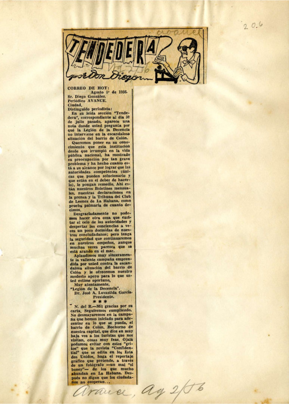 Tendedera: [Carta de la Legión de la Decencia sobre la eleminación del barrio de Colón.]