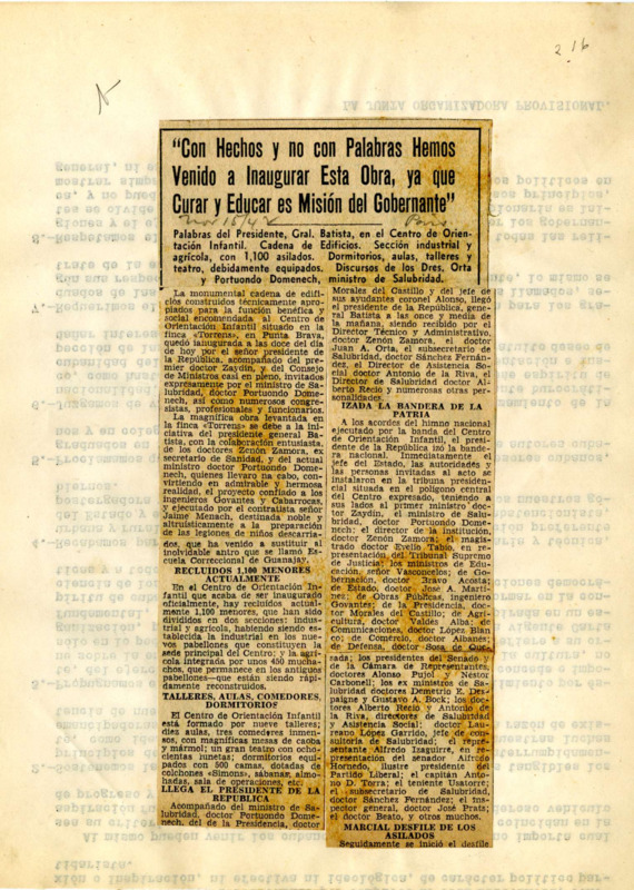 " Con hechos y no con palabras hemos venido a inaugurar esta obra, ya que curar y educar es misión del gobernante: palabras del presidente Gral Batista en el Centro de Orientación Infantil...