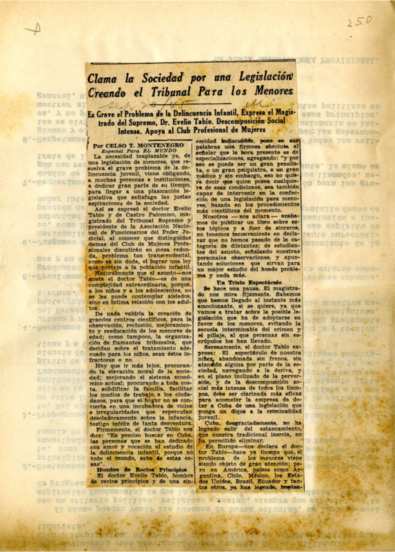 Clama la sociedad por una legislación creando el tribunal para los menores: es grave el problema de la delincuencia juvenil, expresa el magistrado…