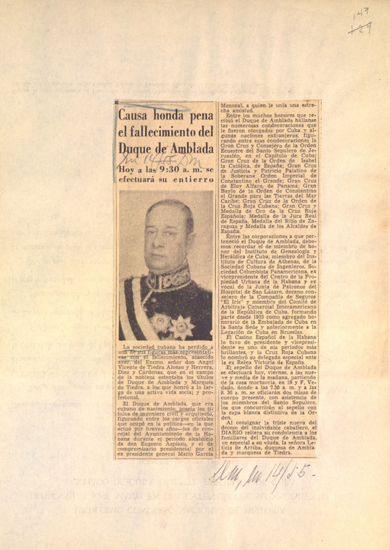 Incluye fotografía del Duque de Amblada y notas necrológicas publicadas por el Diario de la Marina..