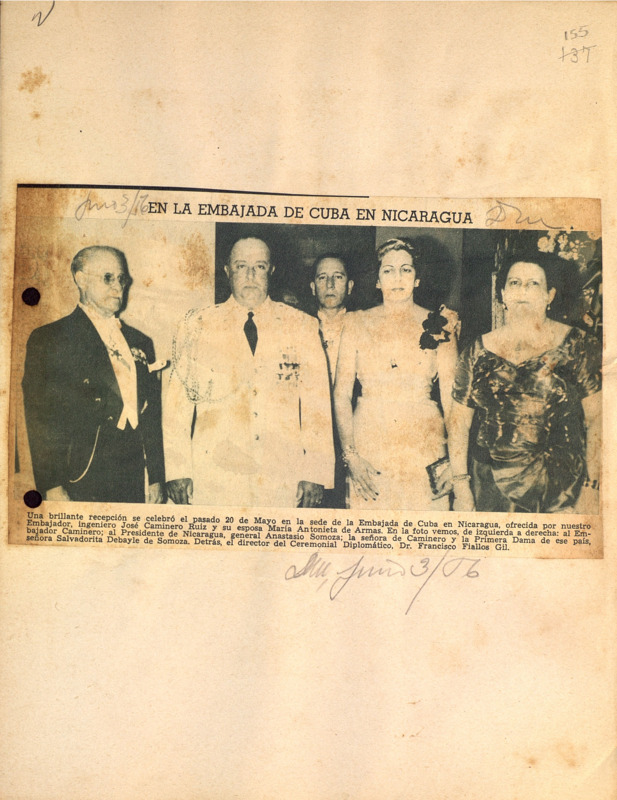 Incluye fotografía Aparecen el presidente de Nicaragua, general Anastasio Somoza y esposa; el embajador José Caminero Ruiz y su esposa