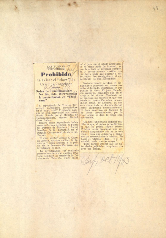 Las Buenas costumbres: prohibido televisar el show de Cristina Jorgensen: no ha sido interrumpida la presentación en Tropicana.