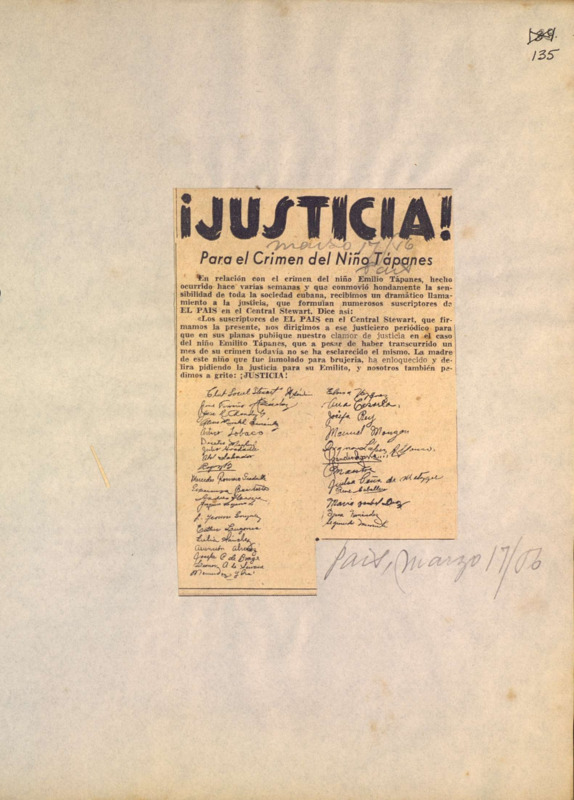 ! Justicia!: para el crimen del niño Tápanes.