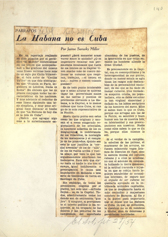 Es un a réplica del texto publicado en El Mundo, 24 de feb de 1956 en el que se intenta demostrar que la capital es representación de la nación.