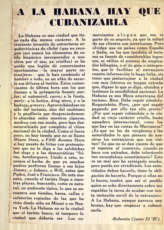 Es un editorial que se refiere al uso de los términos norteamericanos para denominar los comercios. Al final del artículo aparece impreso Bohemia, jun.23/1957