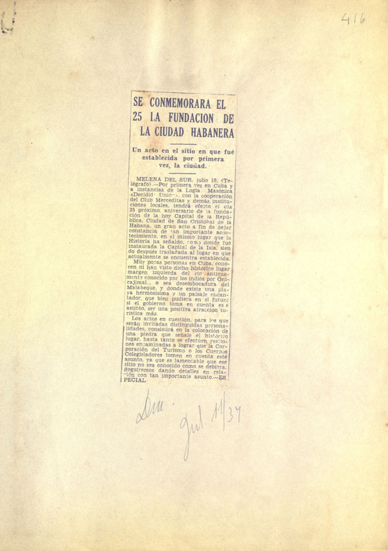 Se conmemorará el 25 la fundación de la ciudad habanera: un acto en el sitio en que fue establecida por primera vez la ciudad.