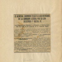 El general Crowder felicita a los miembros de la comisión liberal por su consecuencia y su buena fe. Parte de documento