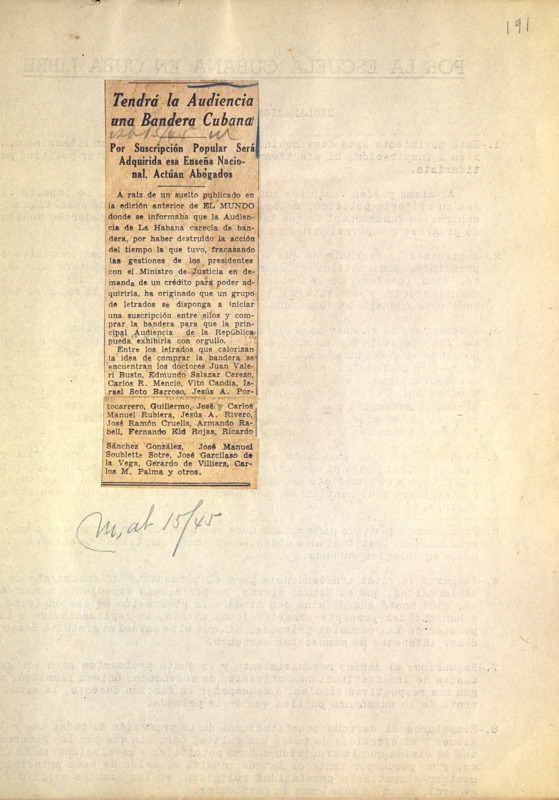 Tendrá la Audiencia una bandera Cubana : por suscripción popular será adquirida esa enseña nacional : actúan abogados