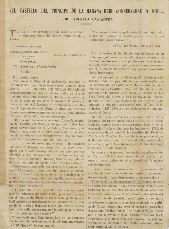 La carta la dirige Pedro Pando y Cintra al autor de este artículo y él mismo responde, abordando el tema de dicha conservación del castillo.