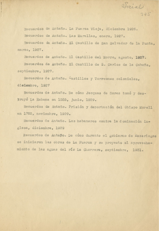 Mecanuscrito. En el borde superior derecho aparece la palabra Social manuscrita. Las referencias bibliográficas de la p. 285 corresponden a la sección Recuerdos de antaño.