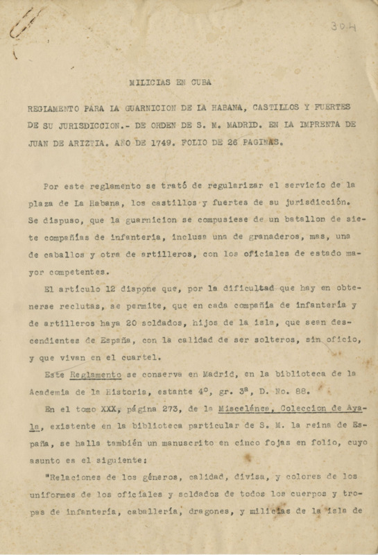 Reglamento para la guarnición de La Habana, castillos y fuertes de su jurisdicción. De orden de S:M: Madrid, en la imprenta de Juan de Aritza. Año de 1749. Folio de 26 páginas.