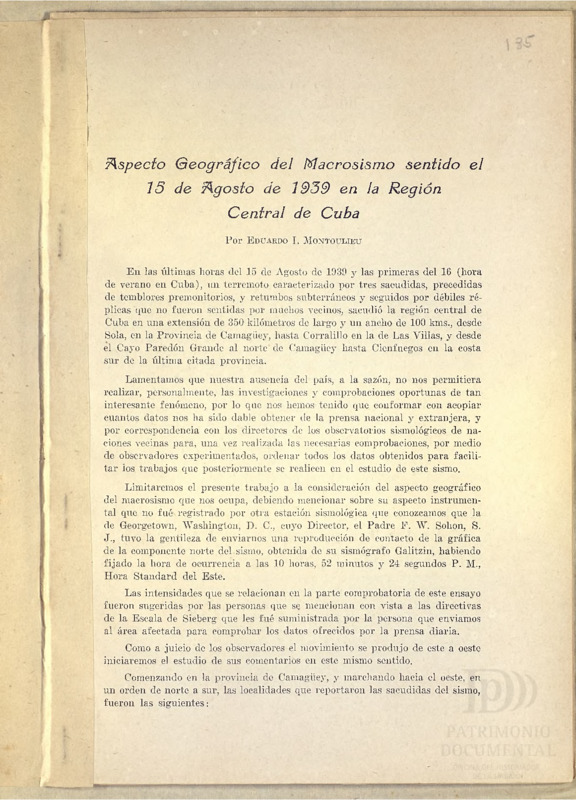 Aspecto geográfico del macrosismo sentido el 15 de agosto de 1939 en la región central de Cuba.