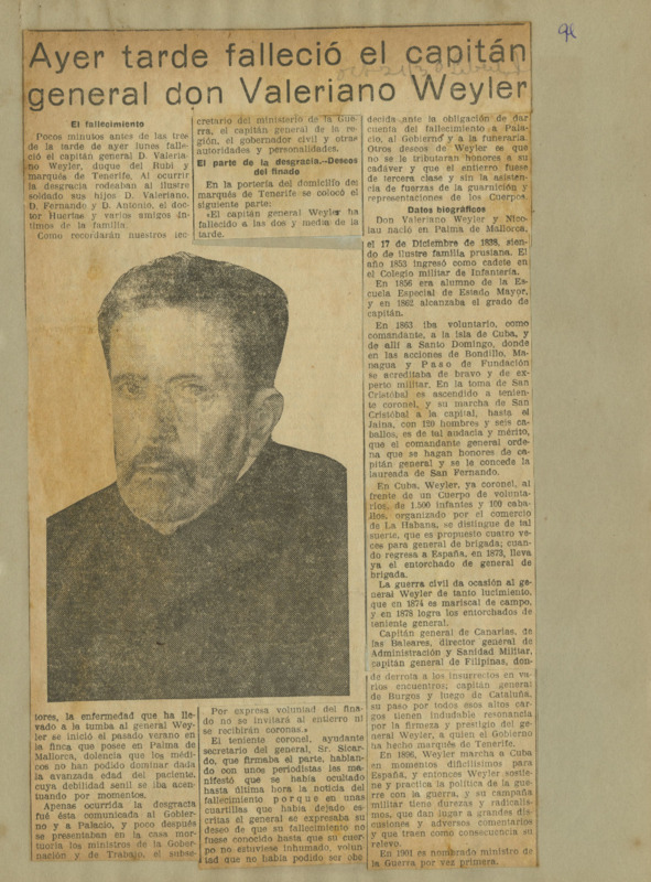 Ayer en la tarde falleció el capitán general Don Valeriano Weyler