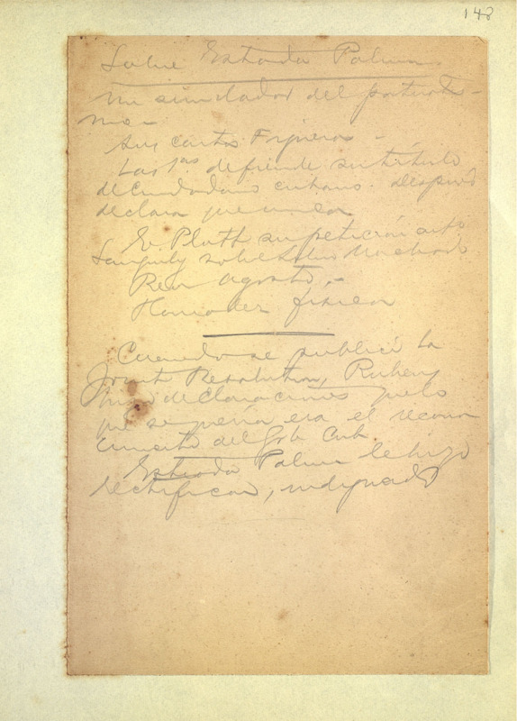 Manuscrito con lápiz y muchas palabras ilegibles. No tiene autor y en lo que se puede leer se nota una opinión que lo considera "un simulador del patriotismo."