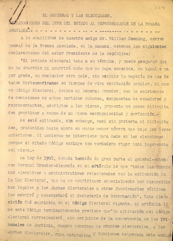 El Gobierno y las elecciones : declaraciones del Jefe de Estado al representante de la Prensa Asociada.