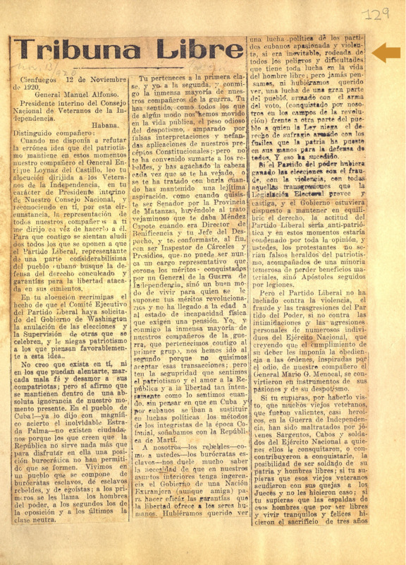 Carta enviada por Oscar Soto remitida desde Cienfuegos y con fecha 12 de noviembre de 1920 dirigida al general Manuel Alfonso, presidente interino del Consejo Nacional de Veteranos de la Independencia en La Habana.Realiza un recuento de lo ocurrido durante el proceso electoral(violencia contra todo aquel que no fuese partidario de la Liga Nacional, fraude, desconocimiento y obstrucción de la justicia por parte del partido gobernante), razones que podrían explicar la petición del Partido Liberal al gobierno americano para que intervenga en las elecciones.
