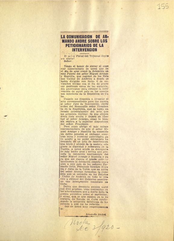 La Comunicación deArmando André sobre los peticionarios de la intervención.