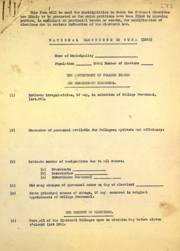 Mecanuscrito. Texto en inglés. Modelo para ser utilizado en las municipalidades en que fueron protestadas las elecciones por la oposición o en el caso de que se hayan anulado por graves infracciones de la Ley Electoral.