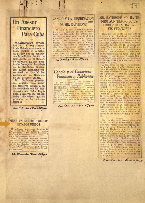 Breve nota que reseña la designación de Albert Rathbone como asesor financiero del gobierno cubano a petición del mismo.