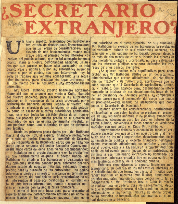 Detalla el actuar de Albert Rathbone, asesor financiero norteamericano solicitado por el Gobierno cubano, que a juicio del autor está usando de atribuciones que competen al Secretario de Hacienda, razón por la que cuestiona el verdadero carácter en que actúa en Cuba Mr. Rathbone.