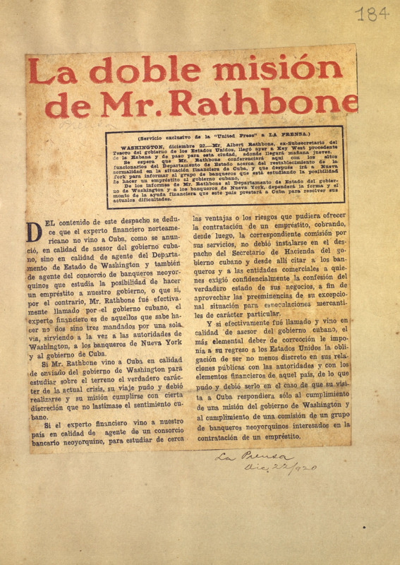 Al reproducir íntegramente un despacho de la United Press de igual fecha que el artículo en el que se manifiesta que Albert Rathbone, asesor financiero norteamericano solicitado por el Gobierno cubano, se reunirá con funcionarios del departamento de Estado para informar sobre su misión en Cuba.