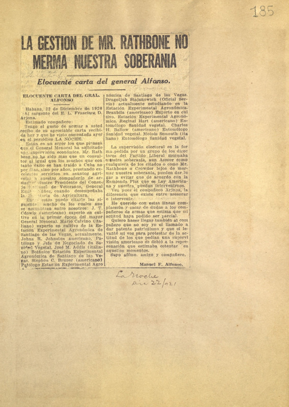 Acuse recibo de la carta escrita por el sargento del Ejército Libertador Francisco O. Arjona en el propio diario. Expresa que a su juicio la solicitud del presidente Menocal al gobierno americano del envío de un asesor financiero constituye una intervención. Brinda los nombres y ocupaciones de diversos asesores extranjeros en asuntos agrícolas.
