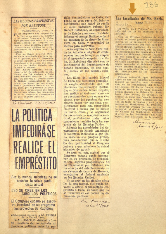 Reproduce artículo publicado el 28 de diciembre de 1920 en el "New YorkTribune" referente a la misión del asesor financiero solicitado por el gobierno cubano al norteamericano.