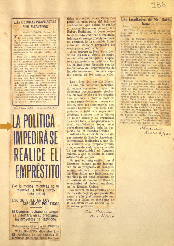 Reproduce cablegrama exclusivo al diario de la United Press con fecha 1 de diciembre de 1920 en el que se hace referencia a las diferencias políticas internas, el proceso electoral y su relación con el informe que habrá de rendir el asesor financiero americano Albert Rathbone al Departamento de Estado sobre la situación financiera del país.
