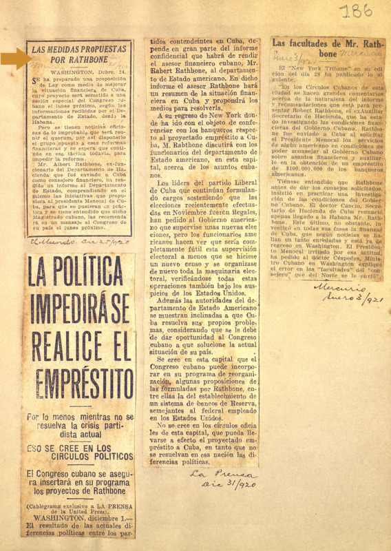 Anuncia la propuesta de ley a presentarse en sesión especial del Congreso cubano para mejorar la situación financiera del país en la que se incluyen las iniciativas de Albert Rathbone el asesor financiero americano solicitado por el Gobierno cubano.