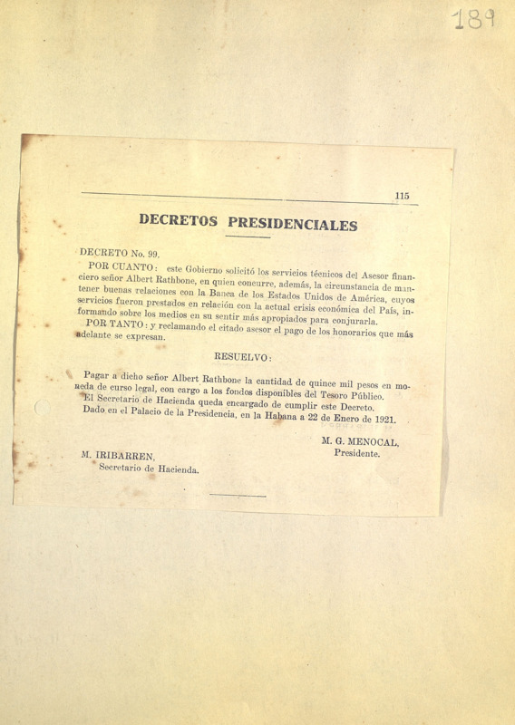Decreto presidencial dado en el Palacio de la Presidencia el 22 de enero de 1921 que resuelve pagar quince mil pesos al asesor financiero americano Albert Rathbone por los servicios prestados en relación con la crisis económica del país.