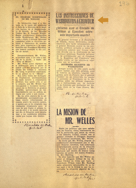 Breve reseña de la reunión sostenida ayer en el Palacio Presidencial entre el general Crowder, el Secretario de Estado, doctor Desvernine y el general Menocal, presidente de Cuba.