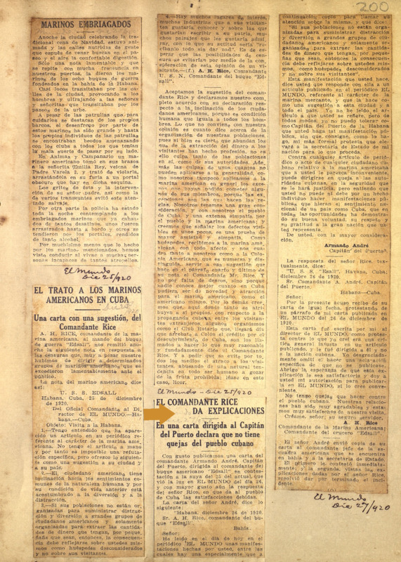 El comandante Rice da explicaciones : En una carta dirigida al Capitán del Puerto declara que no tiene quejas del pueblo cubano.