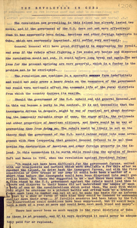 Mecanuscrito. Texto en inglés. Escrito por un americano aborda la situación en Cuba por los procedimientos del presidente Menocal y sus seguidores por un lado y del general Gómez y los liberales por el otro.