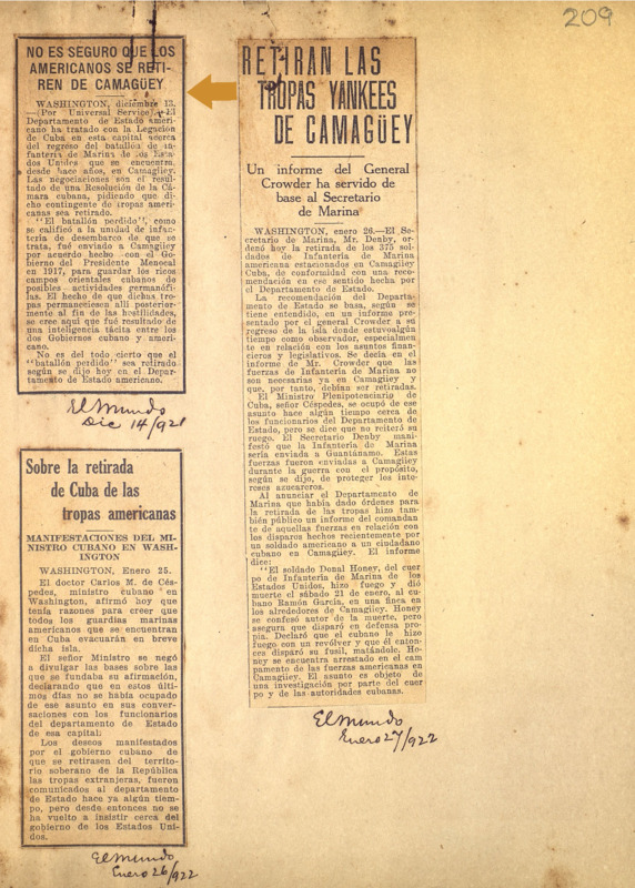 Reproduce cablegrama fechado en Washington diciembre 13 de la Universal Service en el que se abordan las negociaciones entre el Departamento de Estado americano y la legación de Cuba en esta capital para la retirada del batallón de infantería de la marina estadounidense que se encuantra desde 1917 en Camagüey.