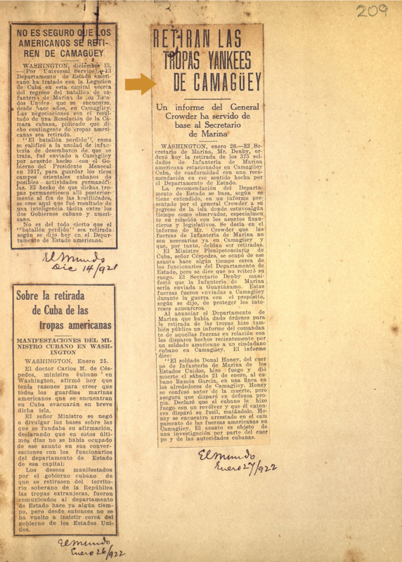 Ordenada por el Secretario de Marina, Mr. Denby sobre la base de un informe del general Crowder a su regreso de Cuba. También brindaINFORMACIÓN sobre un crimen cometido por un soldado americano que dió muerte a un cubano.
