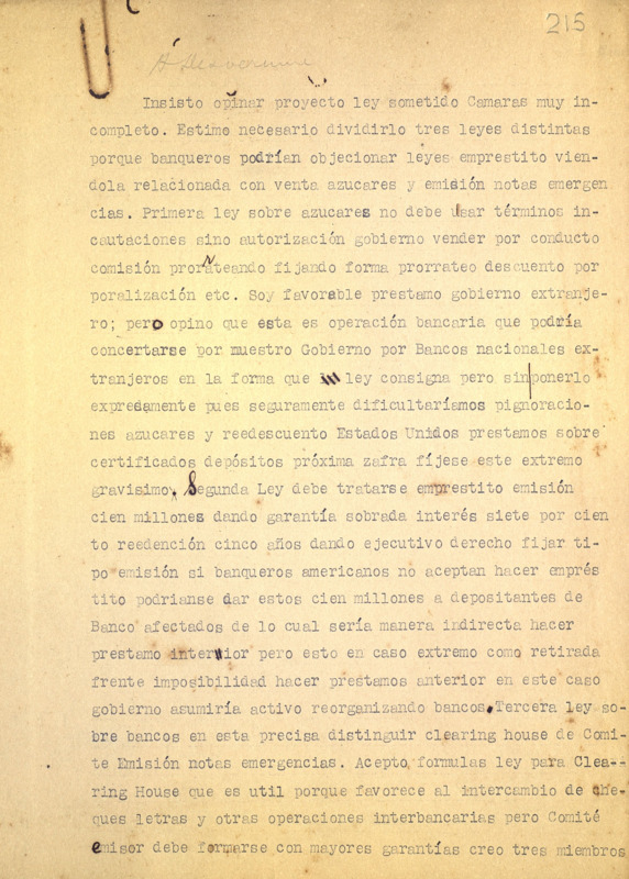 Mecanuscrito. con notas manuscritas sin fecha. El Ministro de Cuba en Estados Unidos brinda sus criterios sobre el proyecto de la ley sometido a discución en la Cámara relacionado con la situación financiera del país y solicitud de préstamos a bancos norteamericanos.