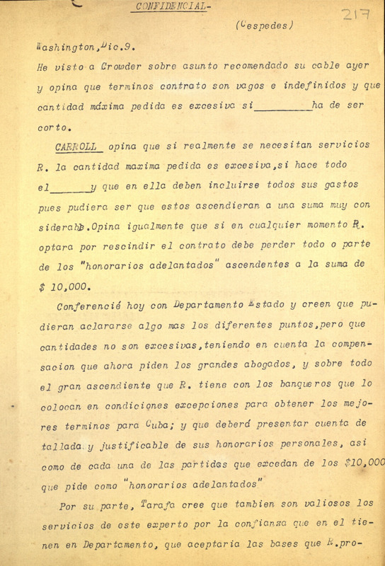 Mecanuscrito. Informe con fecha Washington, diciembre 9. El Ministro de Cuba en Estados Unidos brinda detalles sobre las gestiones en ese país para lograr préstamos bancarios al país.