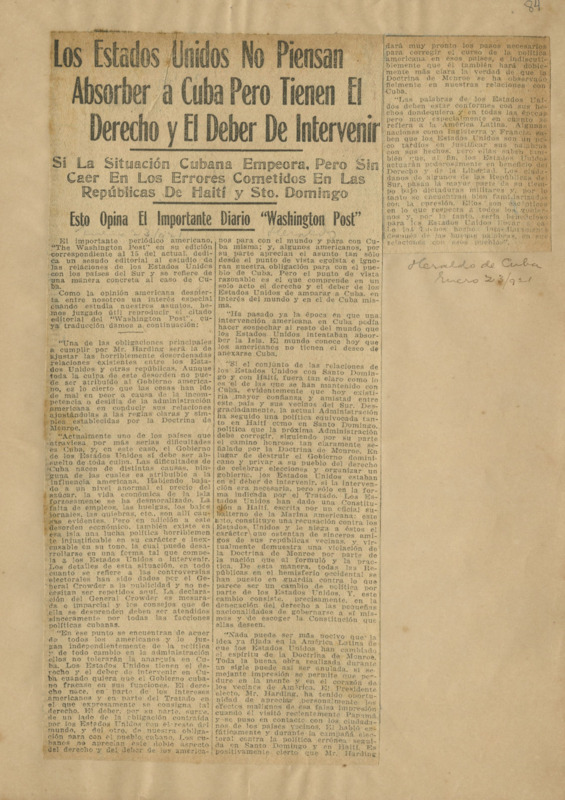 Contiene la reproducción del "Washington Post" que dedica un estudio de las relaciones de E.E.U.U. con los países del sur, de manera concreta, Cuba.