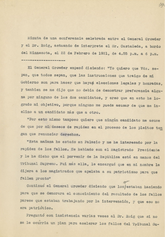 Minuta de una entrevista celebrada entre el Gral Crowder y el Dr. Roig actuando de intérprete el Sr. Castañeda, a bordo del "Minnesota" el 22 de febrero del 21 de 4.55 p.m a 6.p.m..