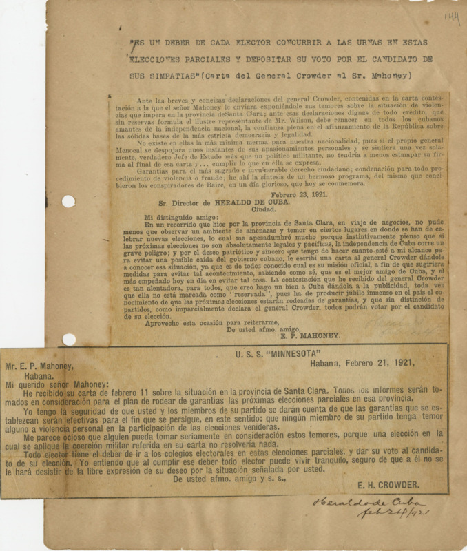 "Es un deber de cada elector concurrir a las urnas en estas elecciones parciales y depositar su voto por el candidato de sus simpatías." (Carta del gral. Crowder al Sr. Mahoney.)
