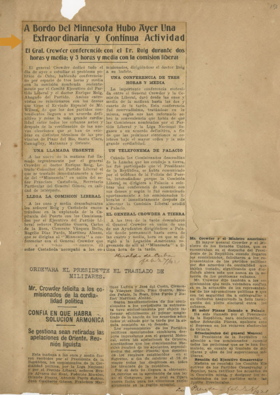 El Gral Crowder conferenció con el Dr. Roig y después con la comisión liberal.