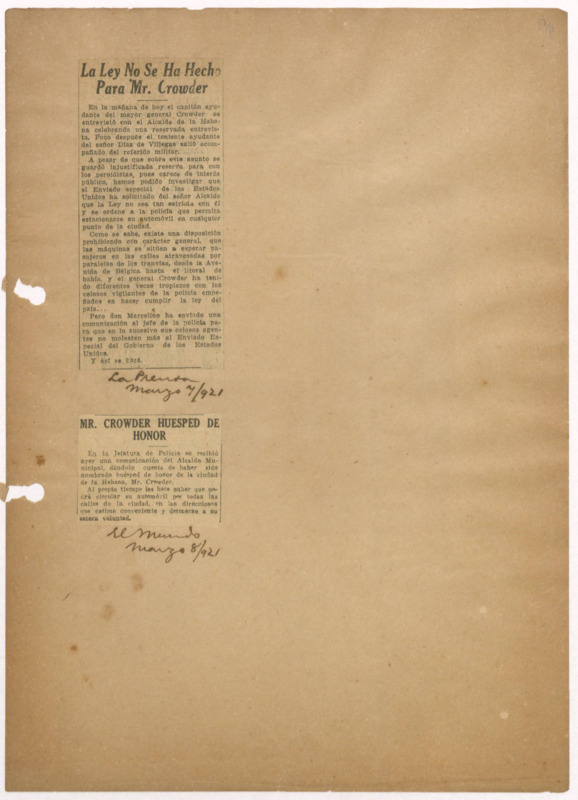 Otra reseña breve con el título "Mr Crowder, huésped de honor", en El Mundo, mar.8/1921