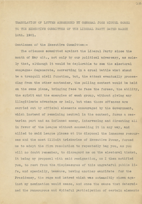 Translation of letter addressed by general José Miguel Gómez to the executive committee of the liberal party dated march 10th.1921.