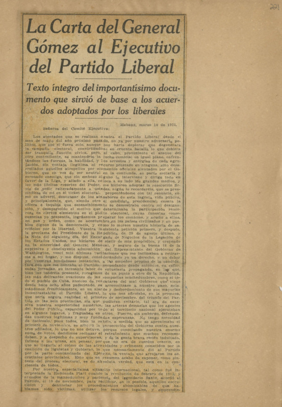 La Carta del general Gómez al ejecutivo del Partido Liberal.