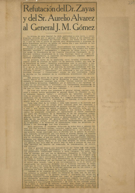 Refutación del Dr. Zayas y del Sr. Aurelio Álvarez al general J. M. Gómez.
