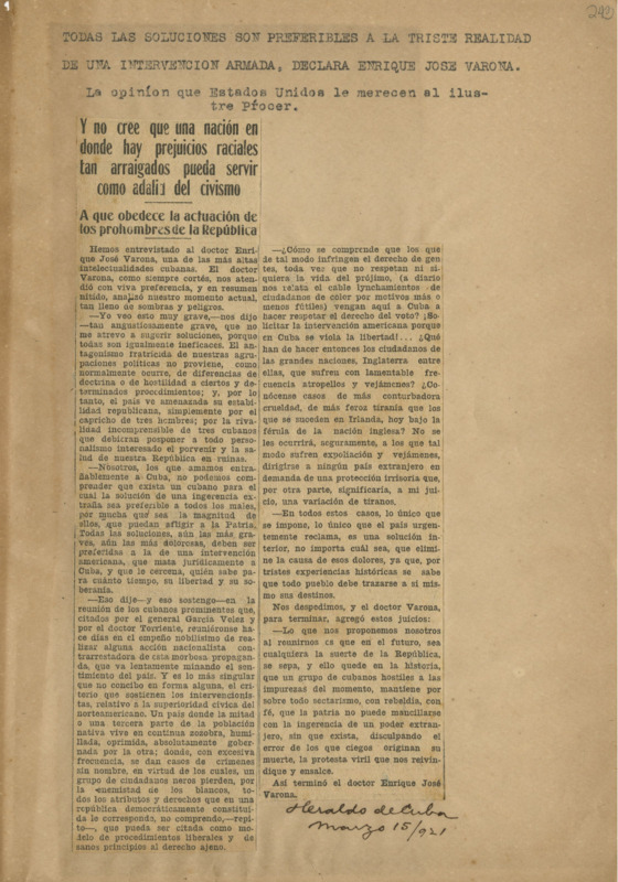 Todas las coluciones son preferibles a la triste realidad de una intervención armada, declara Enrique José Varona.