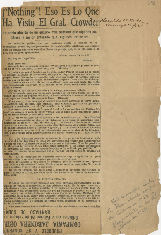 Carta abierta de un guajiro patriota que es en verdad un eminente político que por modestia oculta su nombre bajo el seudónimo El Enviado extraordinario. Aparece además una copia de la proclama que se dirigió al pueblo cubano y aparece manuscrito que lo escribió Carlos La Rosa, alcalde que fue de Cárdenas en 1922 y vicepresidente de la República en 1924.