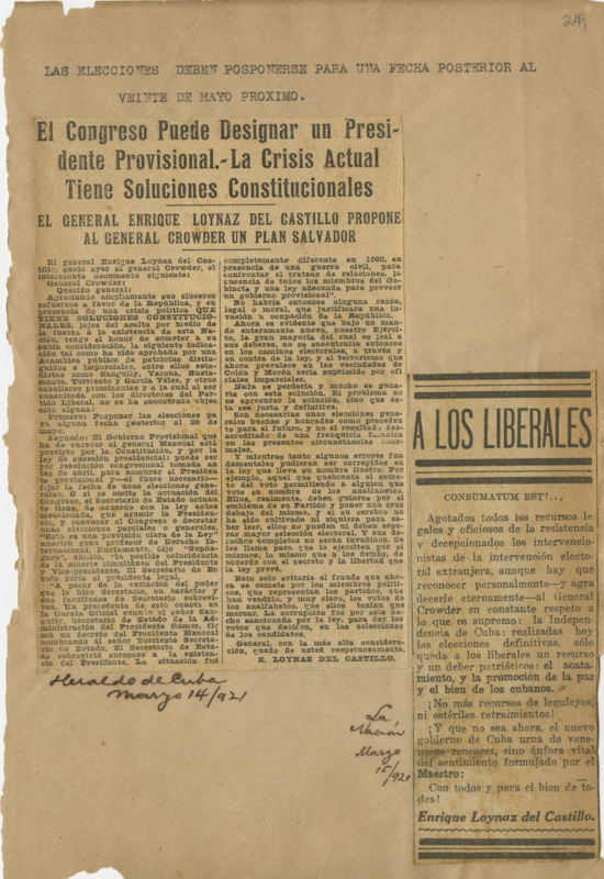 Aparece otra reseña con el título "A los liberales"; es un comunicado que le hace Enrique Loynaz del Castillo a los mismos y la fuente de la resña es La Nación, mar.15/1921.